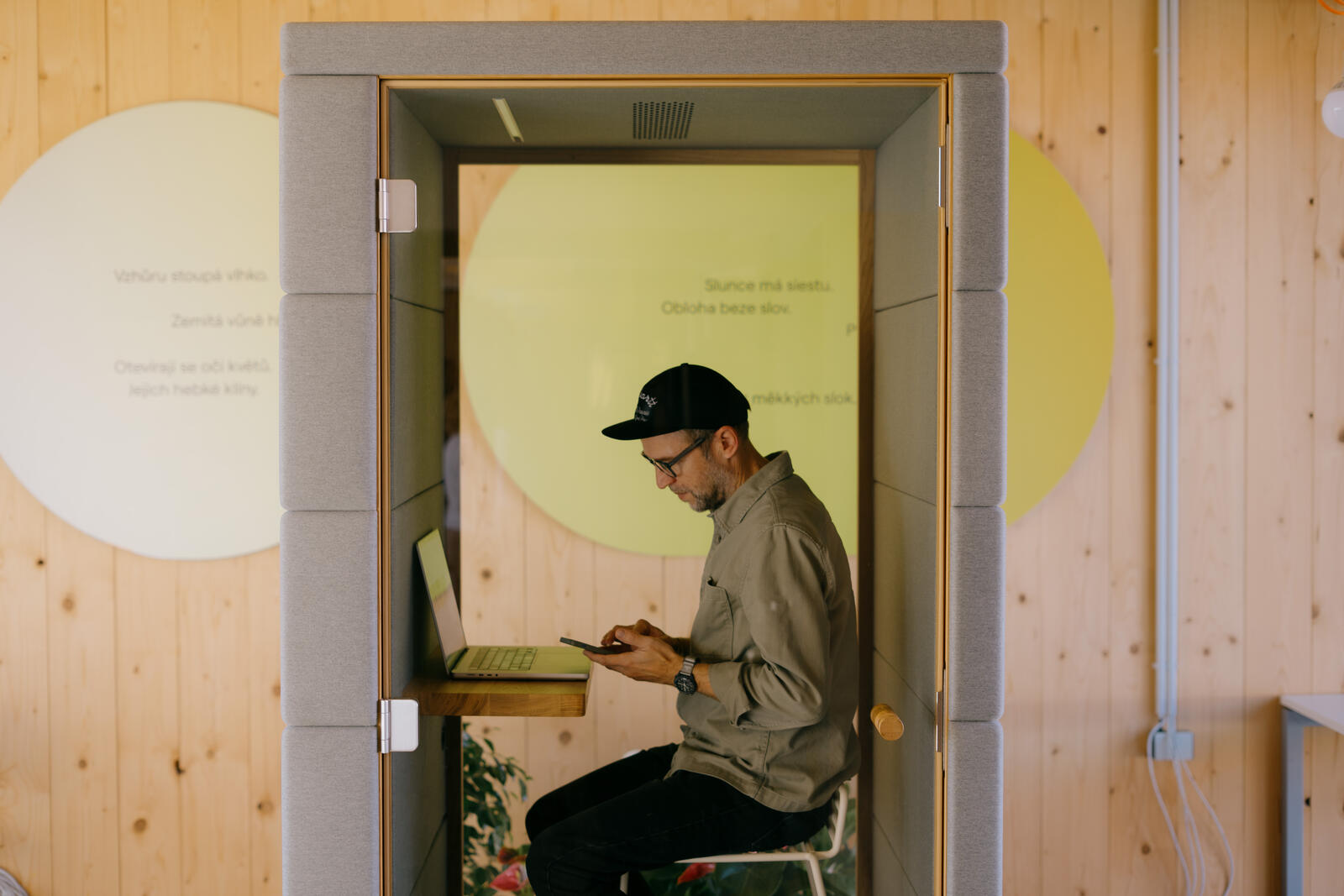 Cabinet nabízí 21 m² plochy, kam se vejde až 12 osob. Je vybavený AV technikou včetně kamery pro online meetingy, pohodlnou pohovkou a především absolutním soukromím. Můžete tu vést schůzku, natáčet webinář nebo prostě vypnout okolní ruch a soustředit se.