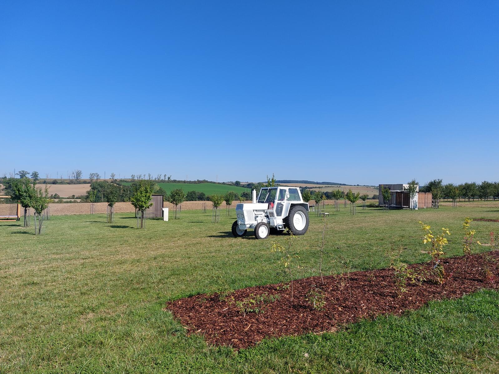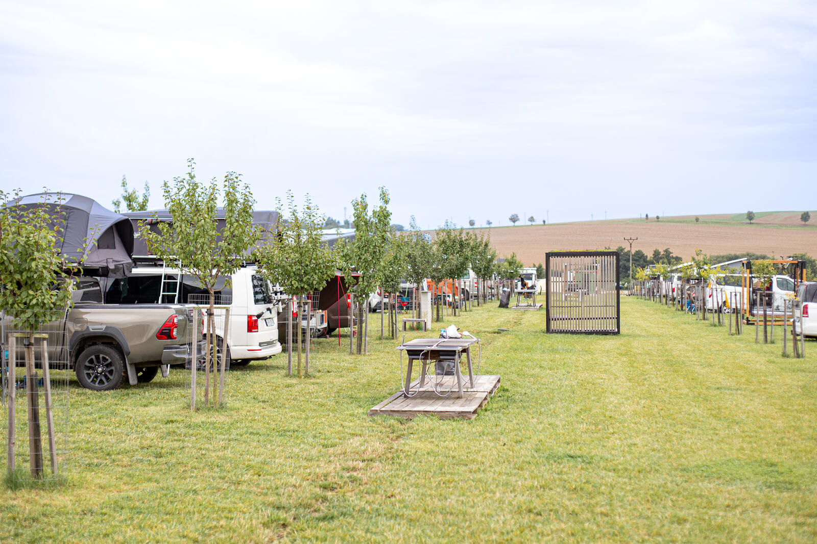 Vpředu dvě trnky, vzadu meruňka a jabloň. Přesně takto může vypadat místo, kde v areálu zaparkujete bydlík, karavan nebo auto s obytnou vestavbou. Kromě stromů totiž v sadu vyrostly i sloupky s elektřinou.