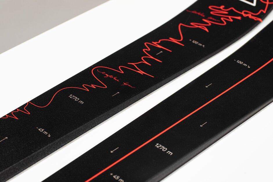 Logo výrobce je skryto na spodní straně lyže, aby nenarušovalo její výtvarnou čistotu.