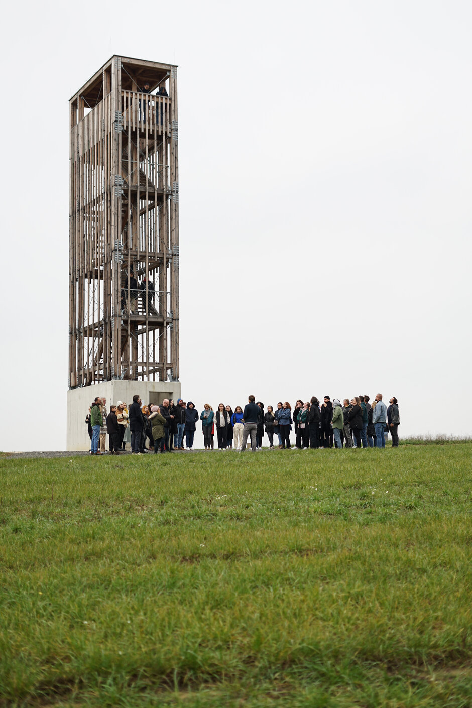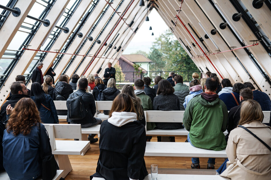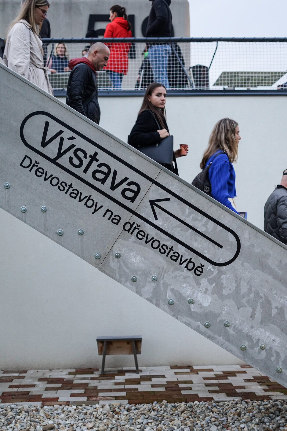 Pro naše účely jsme výstavě dali podtitul Dřevostavby na dřevostavbě. Umístili jsme ji totiž na střechu budovy F, jejíž konstrukce je celá ze dřeva. Vernisáž byla ve čtvrtek 19. října. Zahájení výstavy předcházela autobusová exkurze po vybraných dřevostavbách v okolí. Šlo o sídlo Kloboucké lesní v Brumově-Bylnici, farní centrum v Lidečku a rozhlednu ve Vysokém Poli.