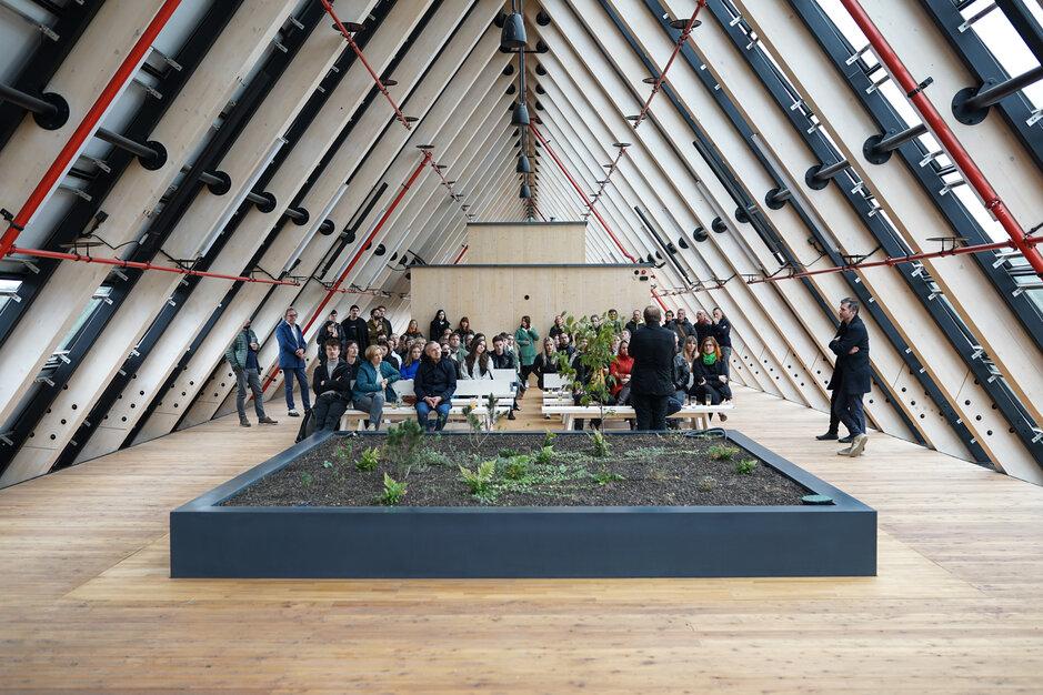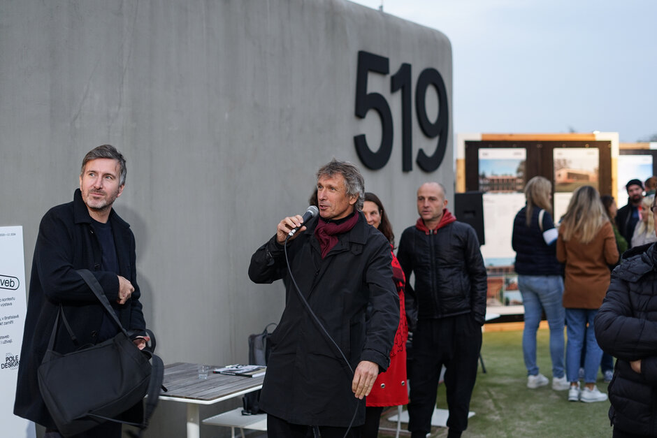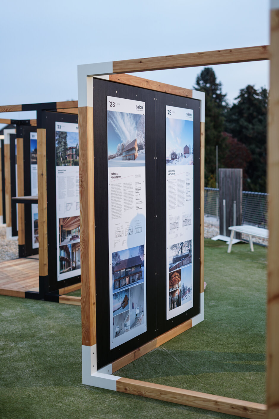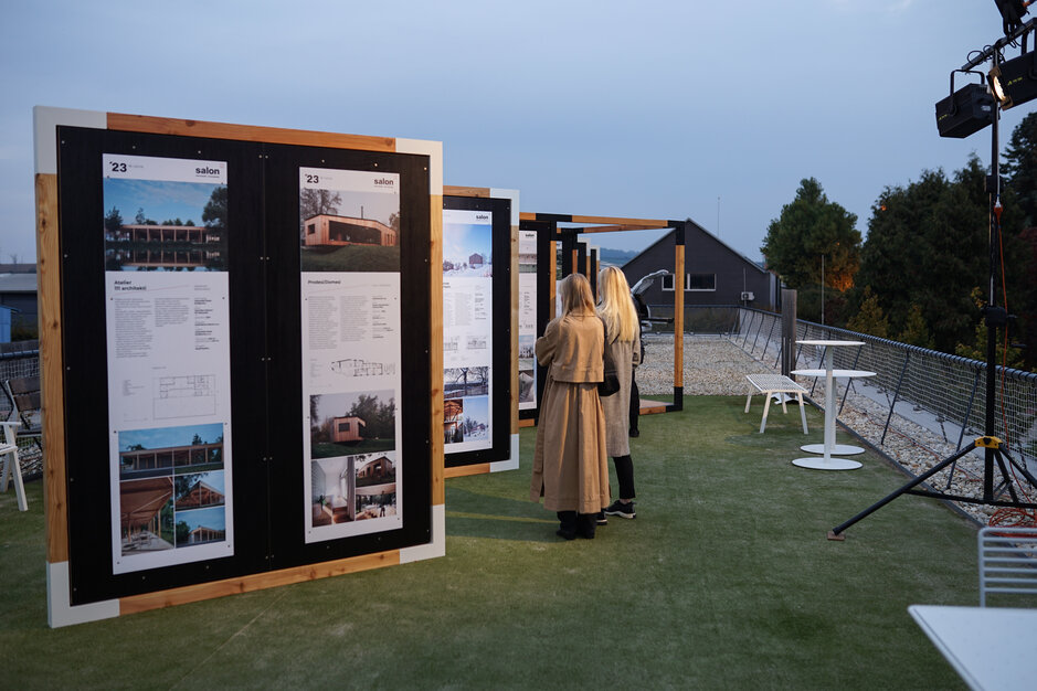 V Praze byla výstava Salonu dřevostaveb instalována na piazzettě Národního divadla, v Bratislavě v Galerie Spolku architektů Slovenska. V Bílovicích projekt zamířil ještě výše – na plochou střechu jedné z budov v areálu. „Jde o atraktivní prostor, navíc je v tom symbolika. Objekt, v němž jsou umístěny kanceláře, jednací místnosti či showroomy, patří do kategorie velkých multifunkčních dřevostaveb,“ říká historik umění a architektury Dan Merta, kurátor Pole designu.