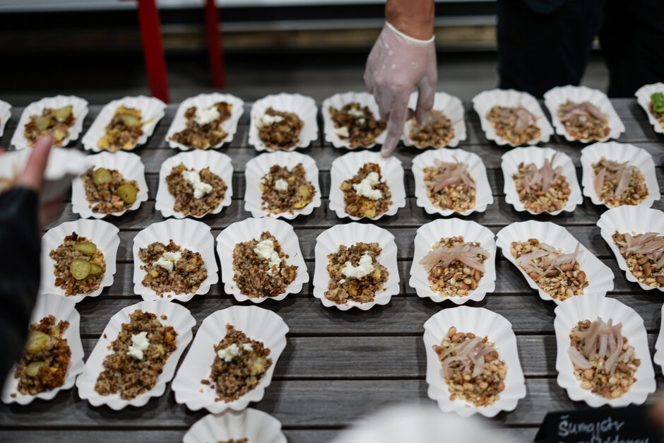 A protože jsme na Poli designu, uzpůsobili jsme tomu i gastro. Do autobusu klasika – řízek mezi dva chleby. Na besedě se pak podávala jídla, která dříve voněla v chalupách na Slovácku a Valašsku několikrát do měsíce. Kontrabáš z brambor a pohanky nebo šumajstr uvařený z krup a fazolí.