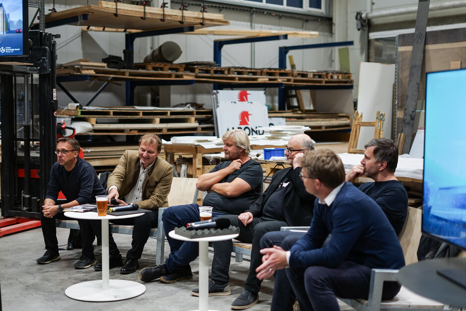 Vrcholem celého dne byla podvečerní debata o dřevostavbách. Z haly E2 jsme udělali na pár hodin improvizovaný konferenční sál s originální atmosférou. Diskusi architektů Pavla Raka, Kamila Mrvy, majitele společnosti Kloboucká lesní Vojty Dorňáka, architekta a jednatele studia Prodesi/Domesi Pavla Horáka a Radka Hegmona moderoval kurátor našeho Pole designu Dan Merta.