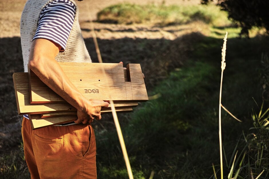 Štok je vyroben jen a pouze ze dřeva. V případě potřeby jej lze rozložit a složit, zvládnete to i sami. Nepotřebujete šrouby, lepidla, ani jiné nástroje než svoje ruce. Do posledního detailu promyšlený design, který jde skutečně k samé podstatě tvaru, znamená, že vznikl velmi univerzální kus nábytku. Složíte z něj posezení včetně stolku, poslouží jako polička na knihy, noční stolek nebo stojan na rostliny. Vytvoří charizmatické vybavení i ve velmi skromných prostorech, jako jsou balkóny nebo malé dvorečky.