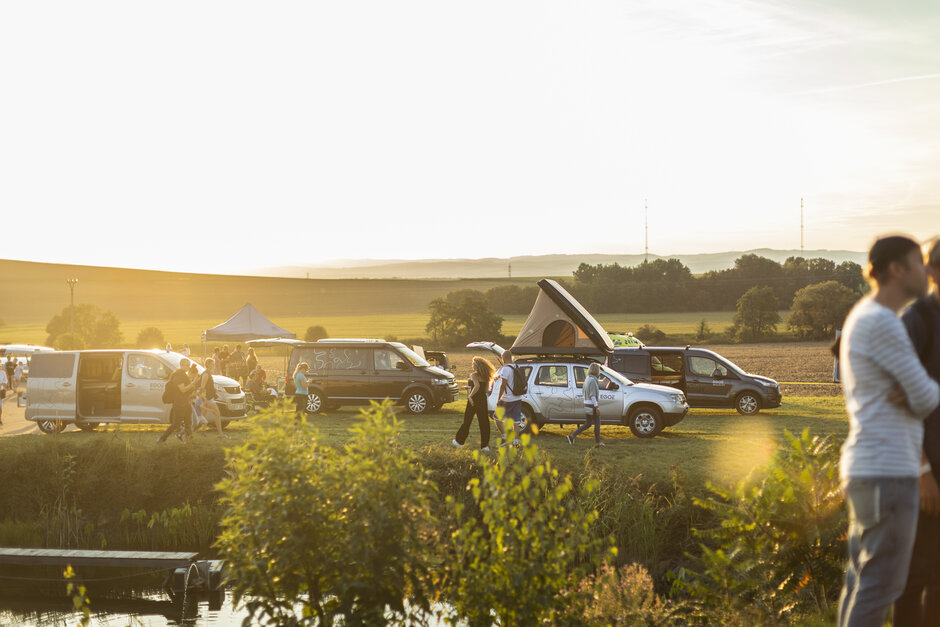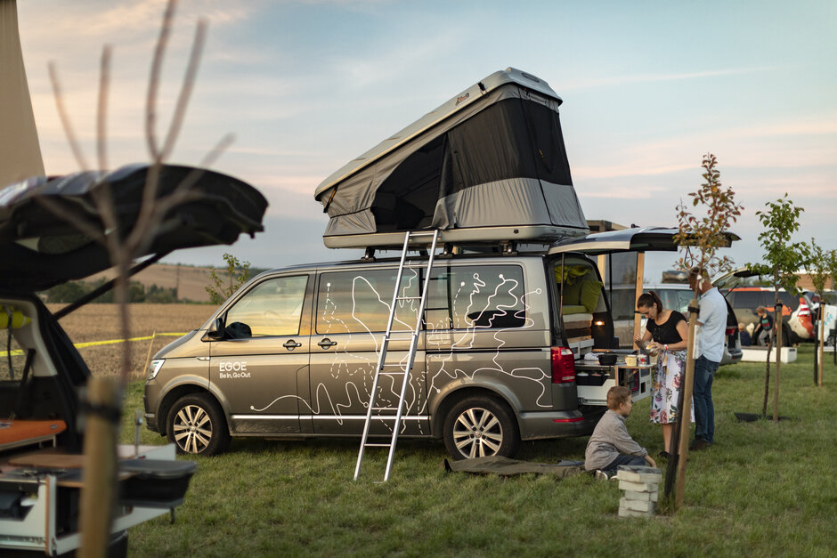 Místa pro stany, auta s vestavbou, karavany nebo bydlíky jsou mezi stromy. Vpravo výhled na Chřiby s hradem Buchlovem, vlevo horizont Přírodního parku Prakšická vrchovina. K tomu jen pár metrů do areálu Egoé, kde z nápadů vznikají produkty. To je Kemp na Poli designu.