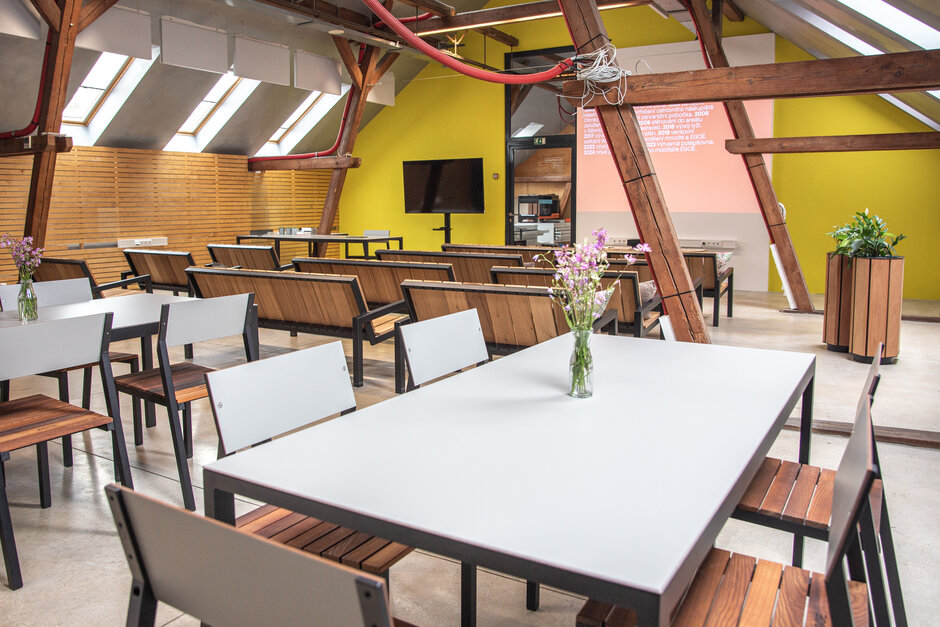 Hlavní prostor, Industriál, pojme přes padesát sedících účastníku. Nabídne kompletní audiovizuální techniku, konektivitu, samoobslužný bar a kuchyňku. Pro komornější jednání je k dispozici lounge salonek Ateliér, který svým vybavením nabízí možnost kombinace práce a relaxace.