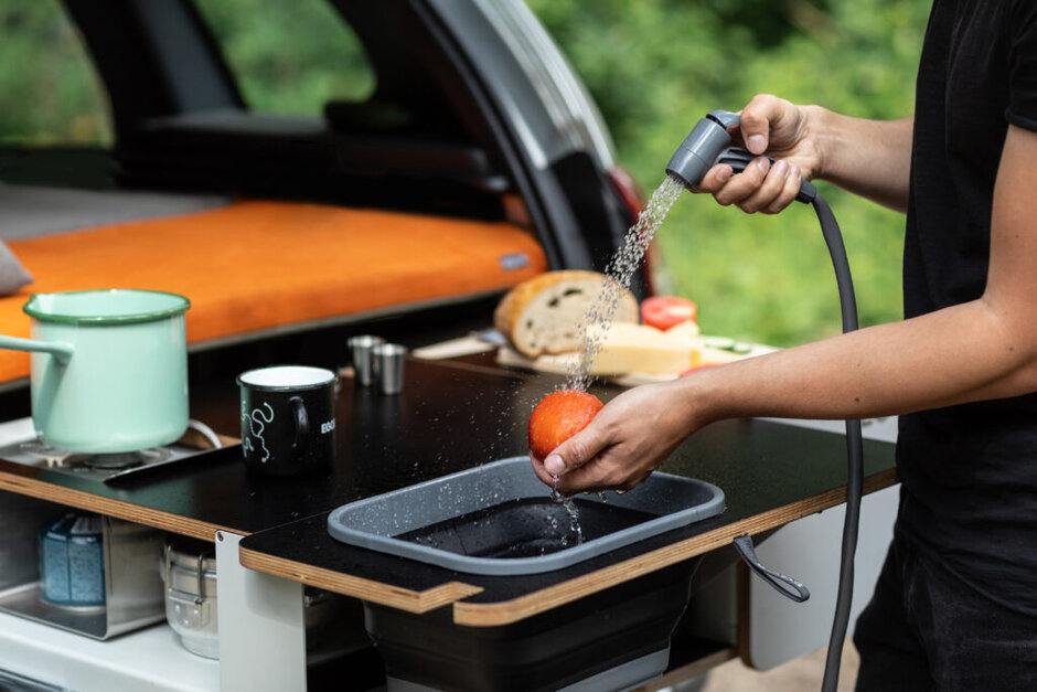 Redukci podstoupil vařič, který je teď však díky tomu lehce vyjmutelný a není těžké vzít ho s sebou na túru. Držák na vařič je jednoduše vyroben z ohýbaného plechu. Detaily jako je nika na nůž a prkýnko však stále vytváří dojem dobře vybavené útulné kuchyně. Původní modul na vodu jsme nahradili vodním vakem. Proud vody lze pohánět nožní pumpou. A pořád ještě zůstalo místo na chladící tašku. Všechny základní funkce zůstaly zachovány a objevil se jeden bonus: s Trampem nepotřebujete elektřinu.