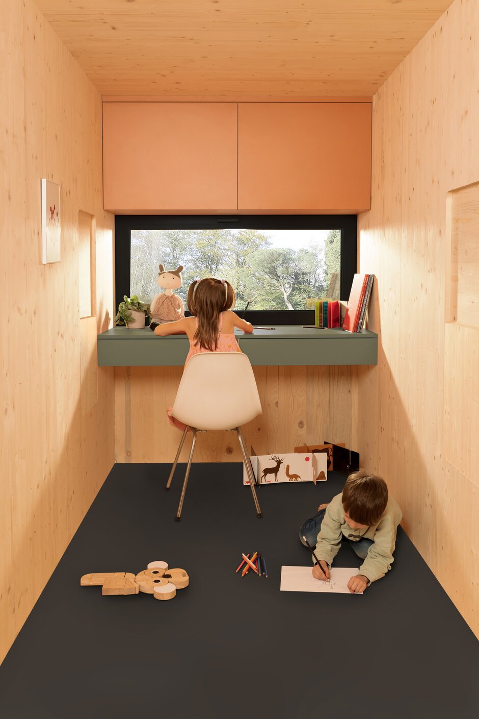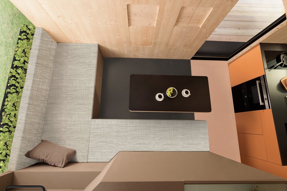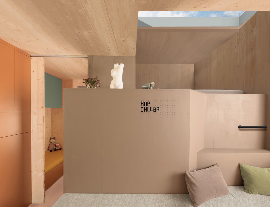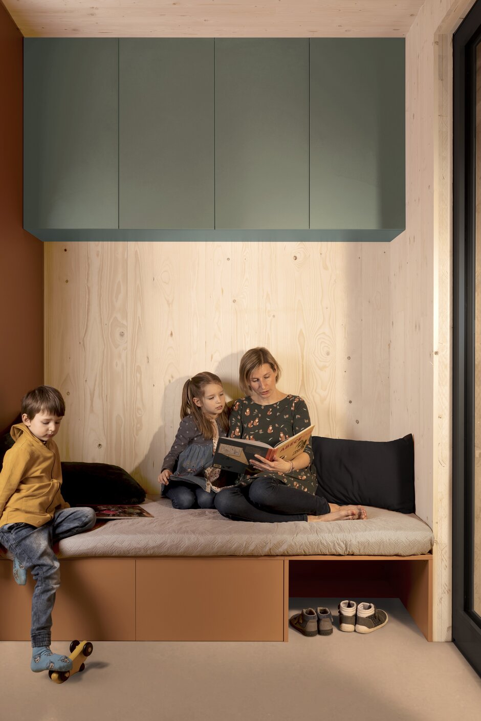 Víceúrovňová podlaha zajišťuje jednak dostatek úložných skříněk a šuplíků, jednak maximální využití prostoru a snadný pohyb mezi všemi moduly, včetně trojstupňového výstupu do ložnice. Koupelnu s WC a pračkou v srdci modulu odvětrá rekuperační zařízení. Vytápění zajišťuje tepelné čerpadlo.